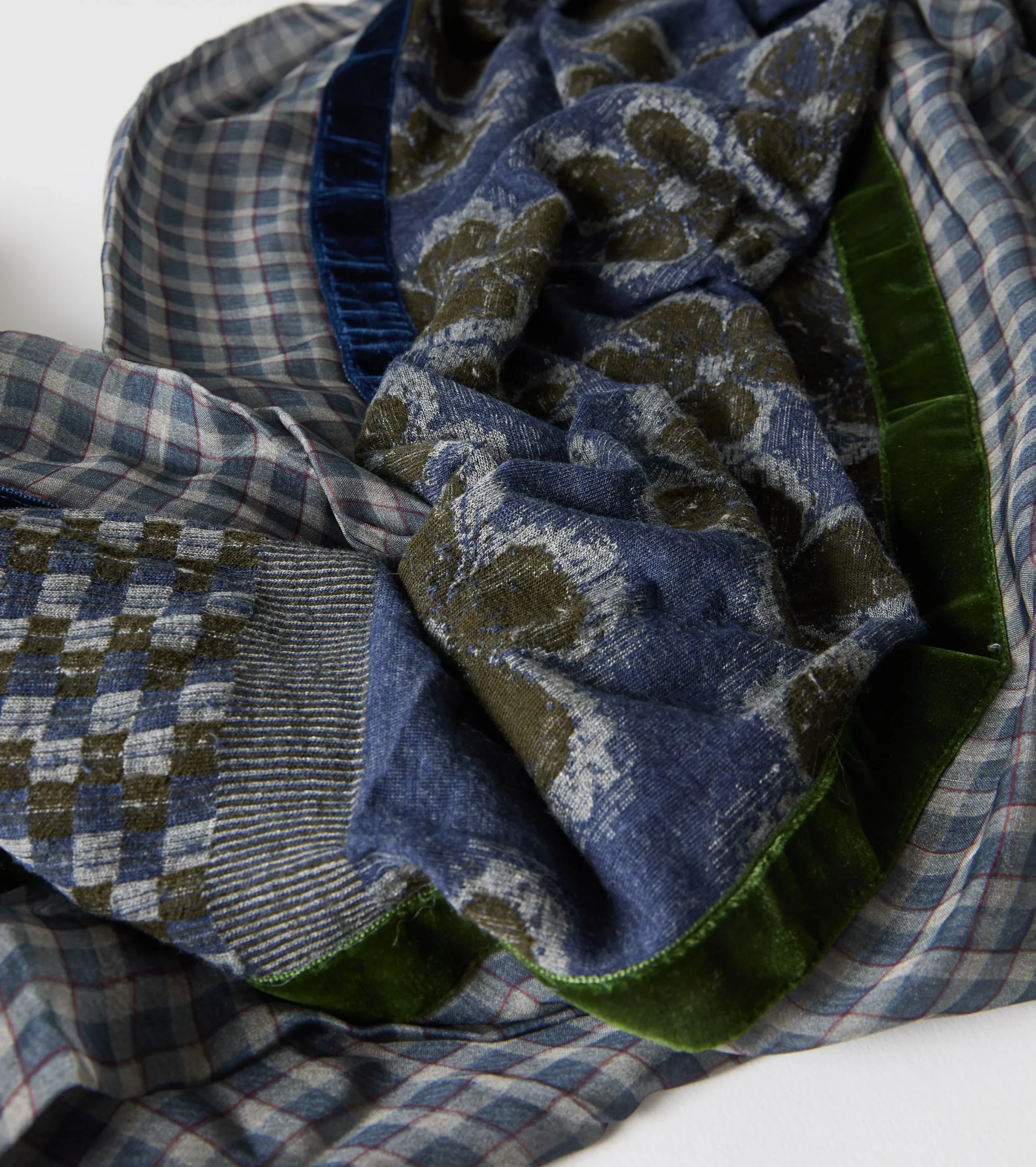 Wool and silk blend scarf with a floral checkered pattern.
