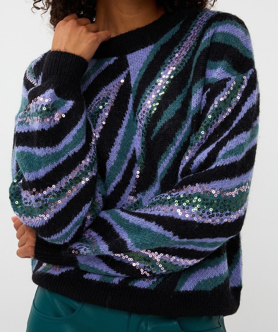 Warm sweater in a graphic zebra print with petrol blue and lilac accents, embellished with small glittering sequins