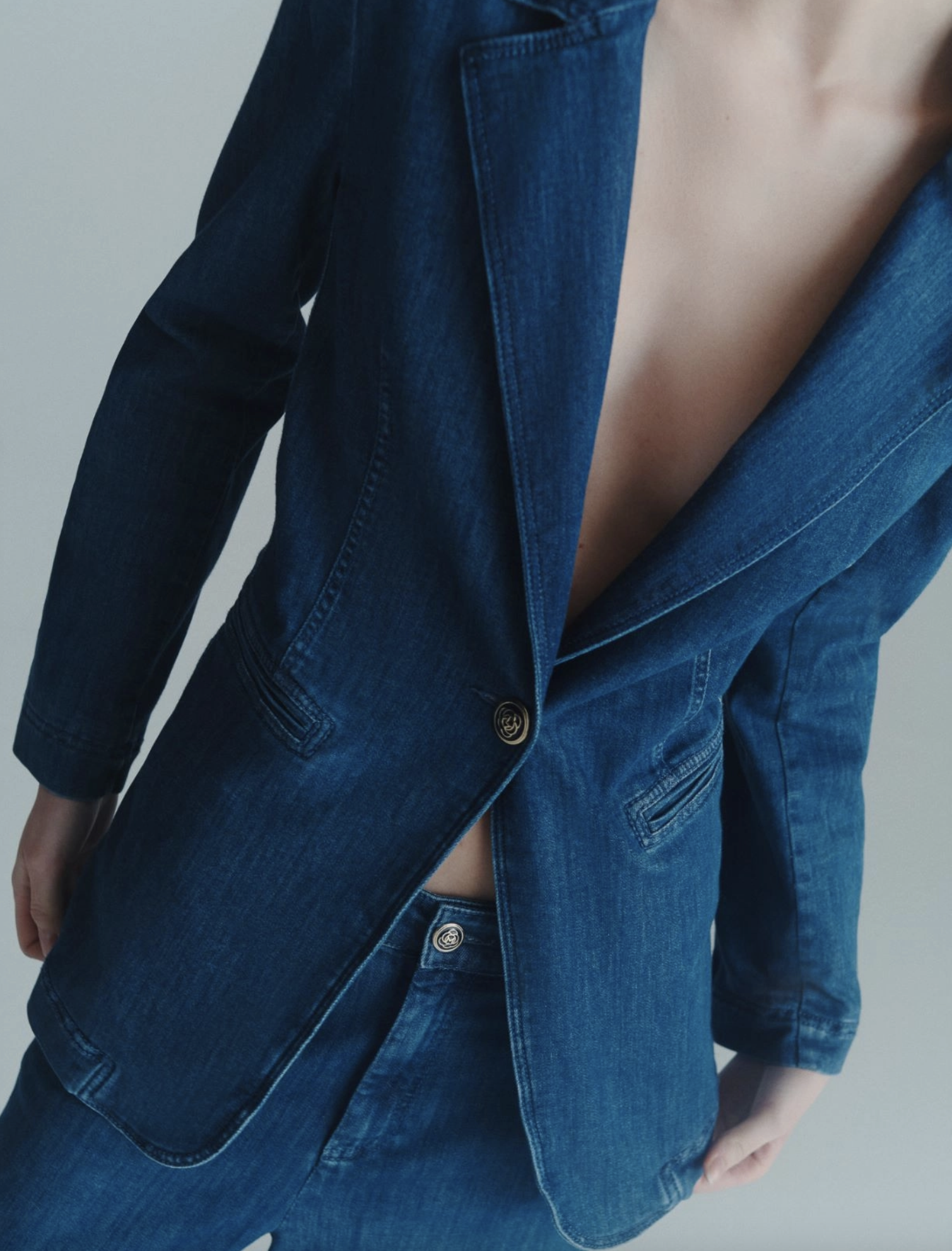 Επενδεδυμένο σακάκι από μπλε ύφασμα denim. Ίσια εφαρμογή. Μονόπετο κούμπωμα με ένα κουμπί και λογότυπο. Ραμμένες στο πλάι τσέπες με ρέλι.